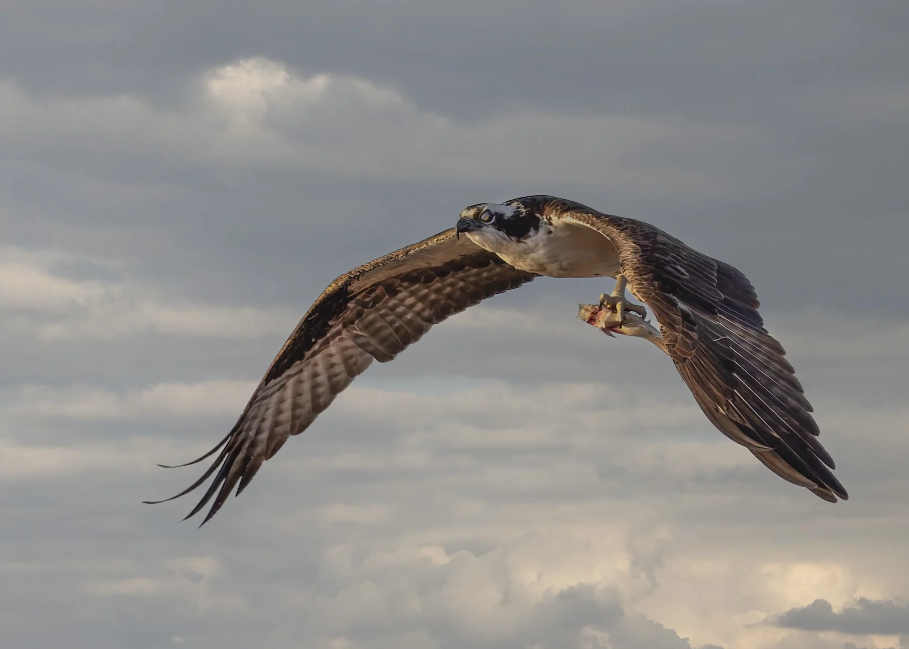 Ospreys heading south in the winter stopover in Oklahoma and are seen perched near the lakes. They search for fish, plunge dive and bring the fish back to the perch where they begin feeding on the head.