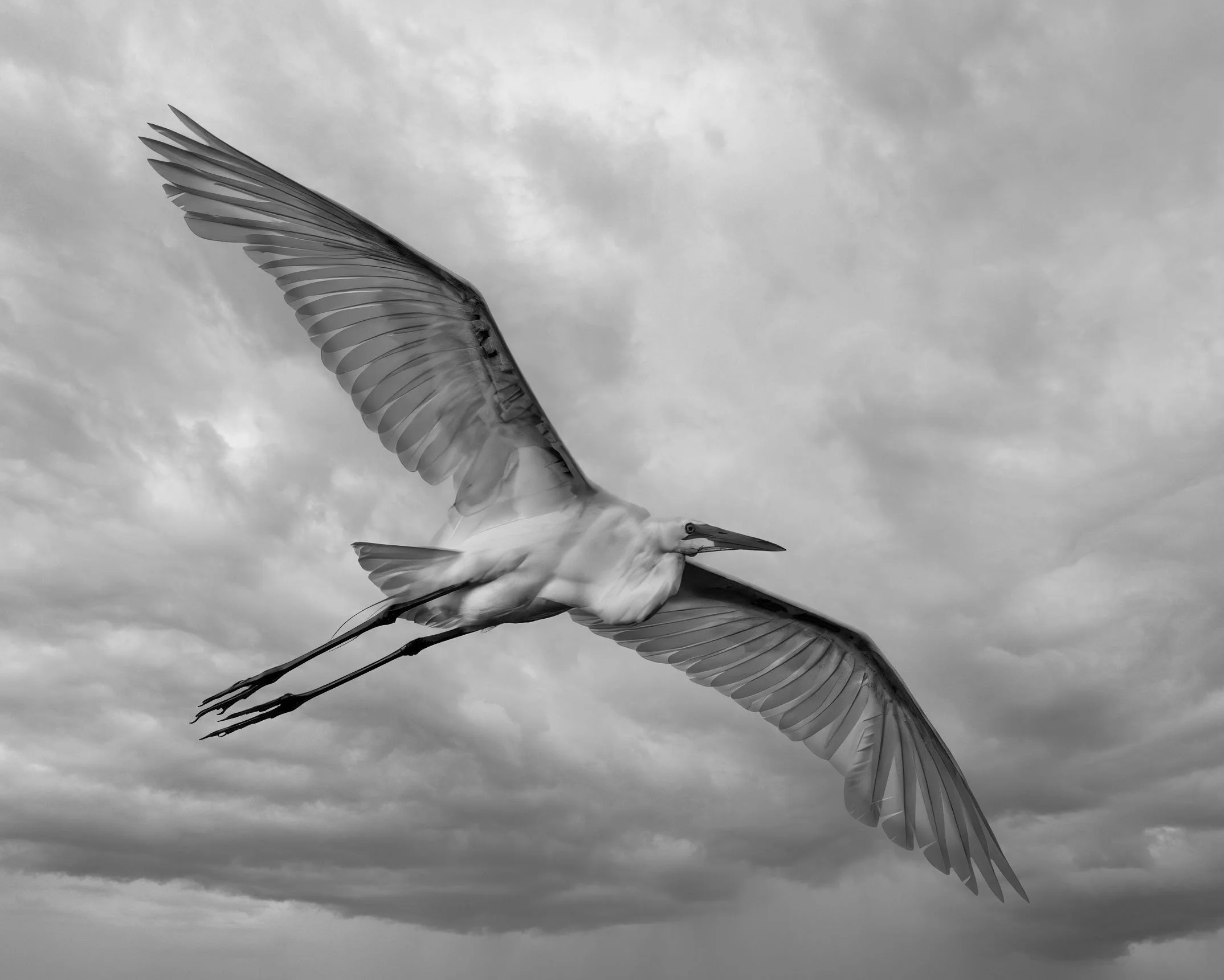 Compositional assets of a photo such as leading lines and contrast show well in black and white with tonal variation from black to white with intervening shades of gray. Occasionally the mood is served better by sepia or blue tones, and subtle expressions of endearment or intense foraging in birds and animals present without the distraction of multiple colors. When I select suitable photos for these qualities birds such as Egrets have strong contrast with the background.