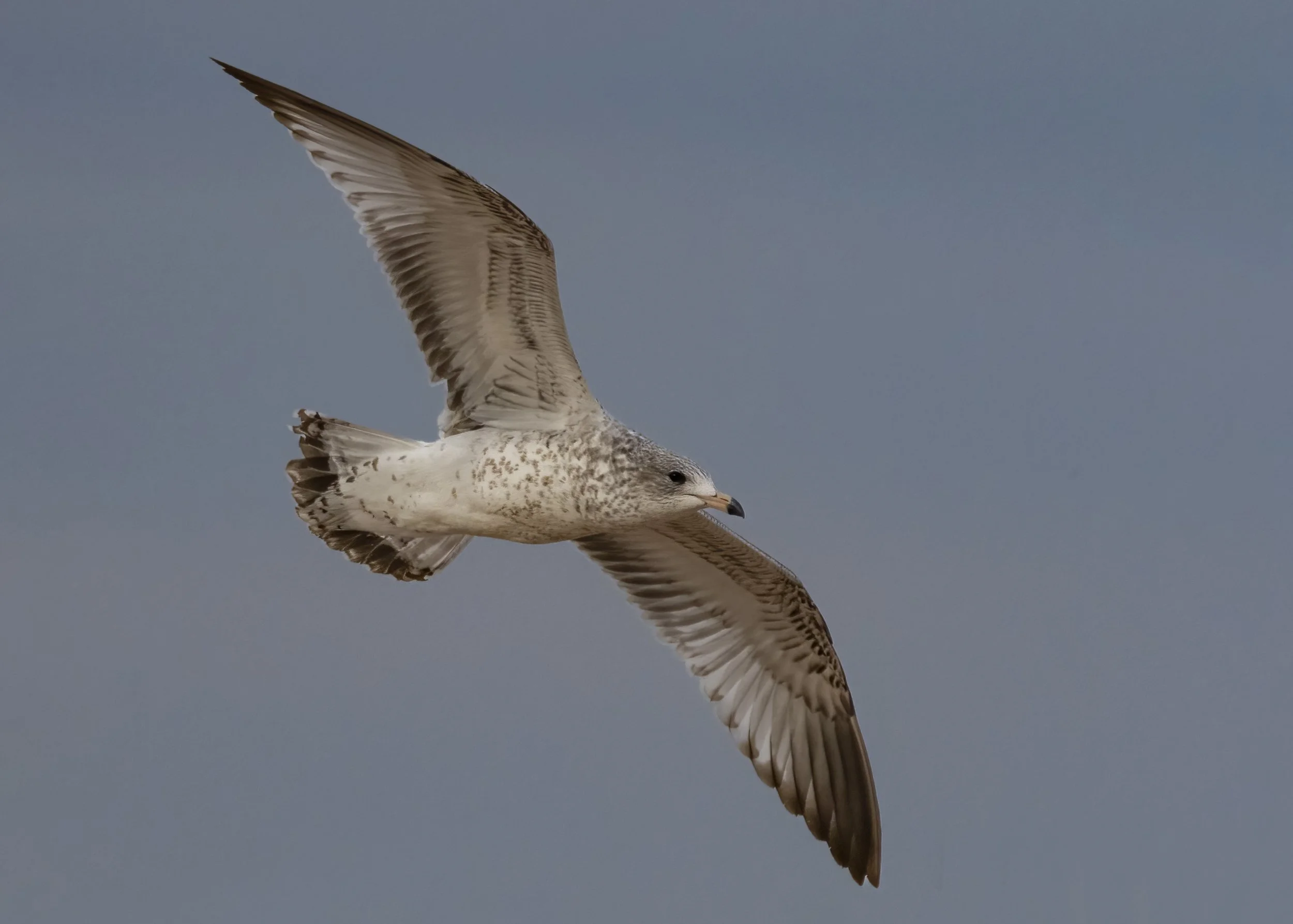 A juvenile Herring Gull changes plumage to mostly white with a gray back. They compete with the common Ring-billed Gull for territory but the two flocks often join together.