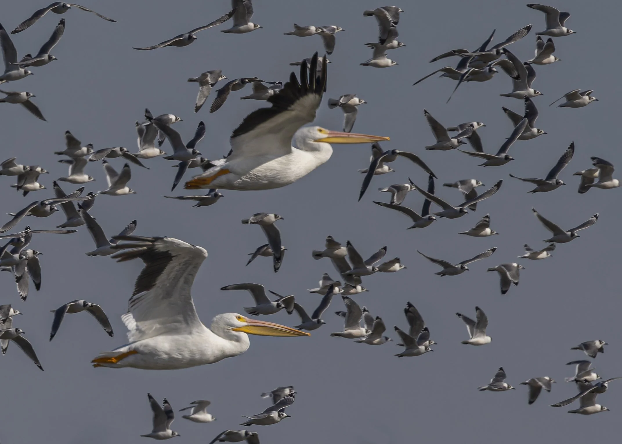 An American White Pelican pair is seen competing for air space with a flock of Franklin Gulls .